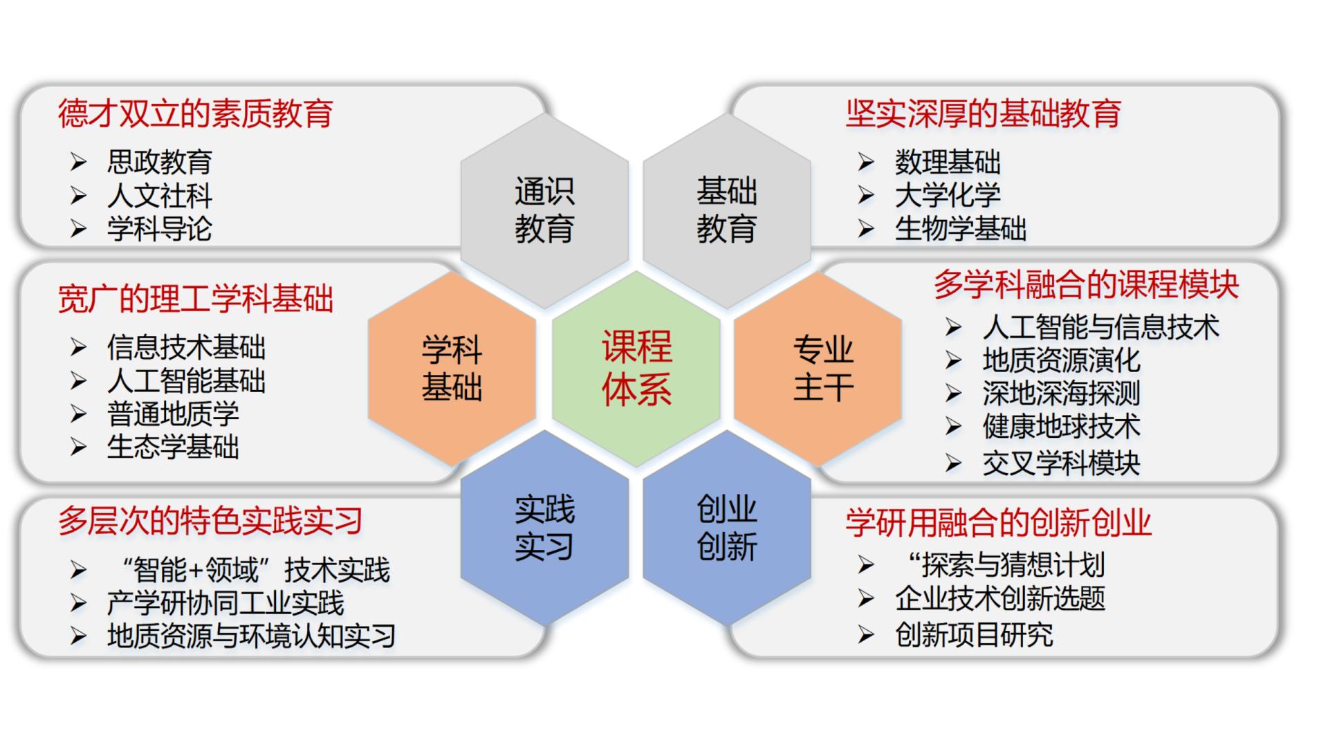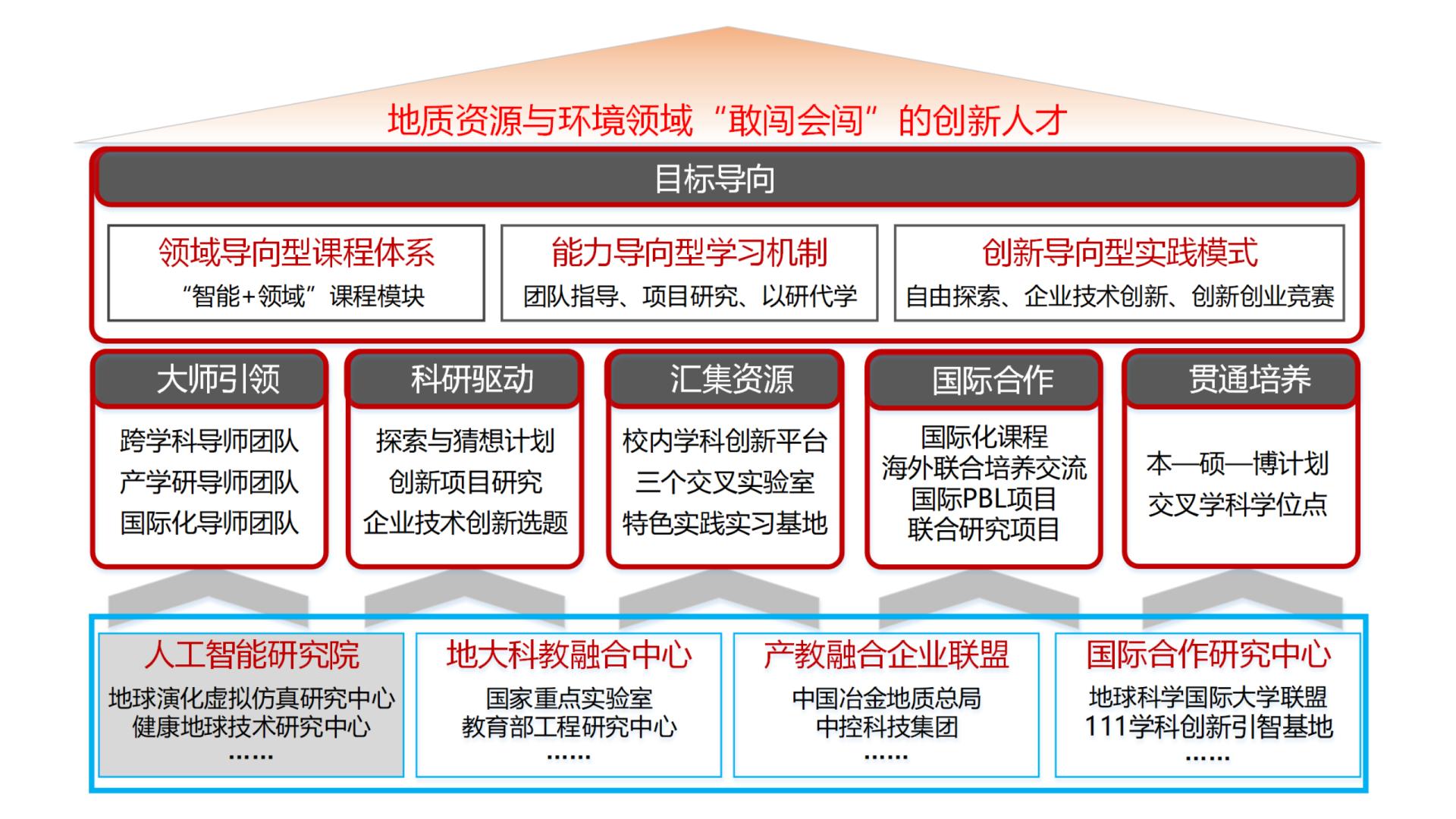 公司汇集公司在地质学、地质资源与地质工程、人工智能、新一代信息技术等领域的优势教学科研资源,打破传统理工专业设置的壁垒,以领域导向型课程体系、能力导向型学习机制、创新导向型实践模式三个创新为载体,以大师引领、科研驱动、资源汇集、国际合作和贯通培养五个维度为抓手,以人工智能研究院、地大科教融合中心、产教融合企业联盟、国际合作研究中心4个平台为基座,构建适应地质资源与环境领域“敢闯会闯”的创新人才培养新范式。