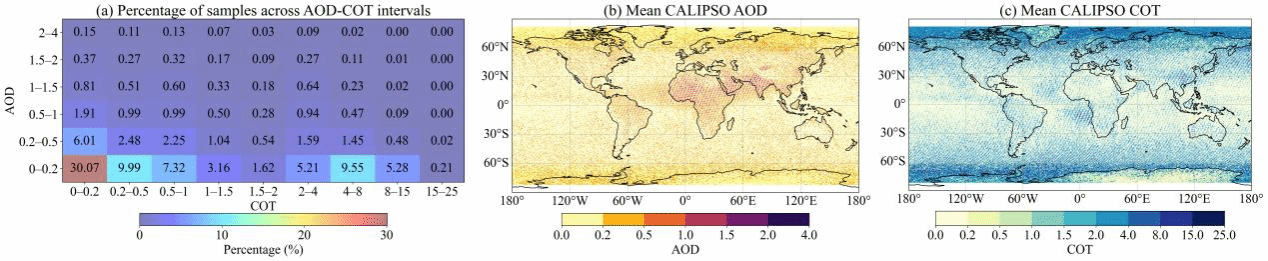 图3. (a)气溶胶-云共存样本在不同CALIPSO AOD-COT区间的比例;(b)与(c)分别为2016-2017年共存样本的平均AOD和COT空间分布图