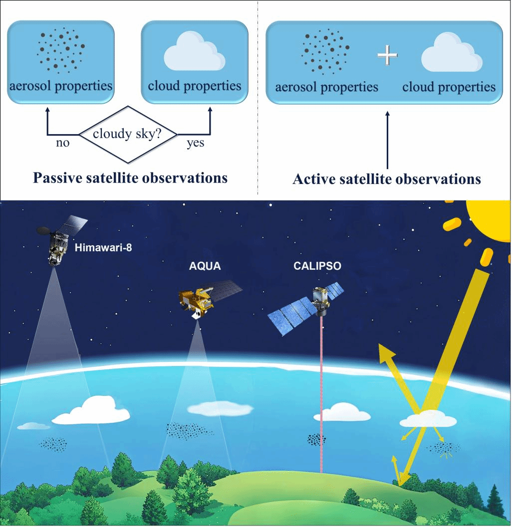 图1. 气溶胶-云共存条件下太阳辐射传输及主被动卫星观测示意图
