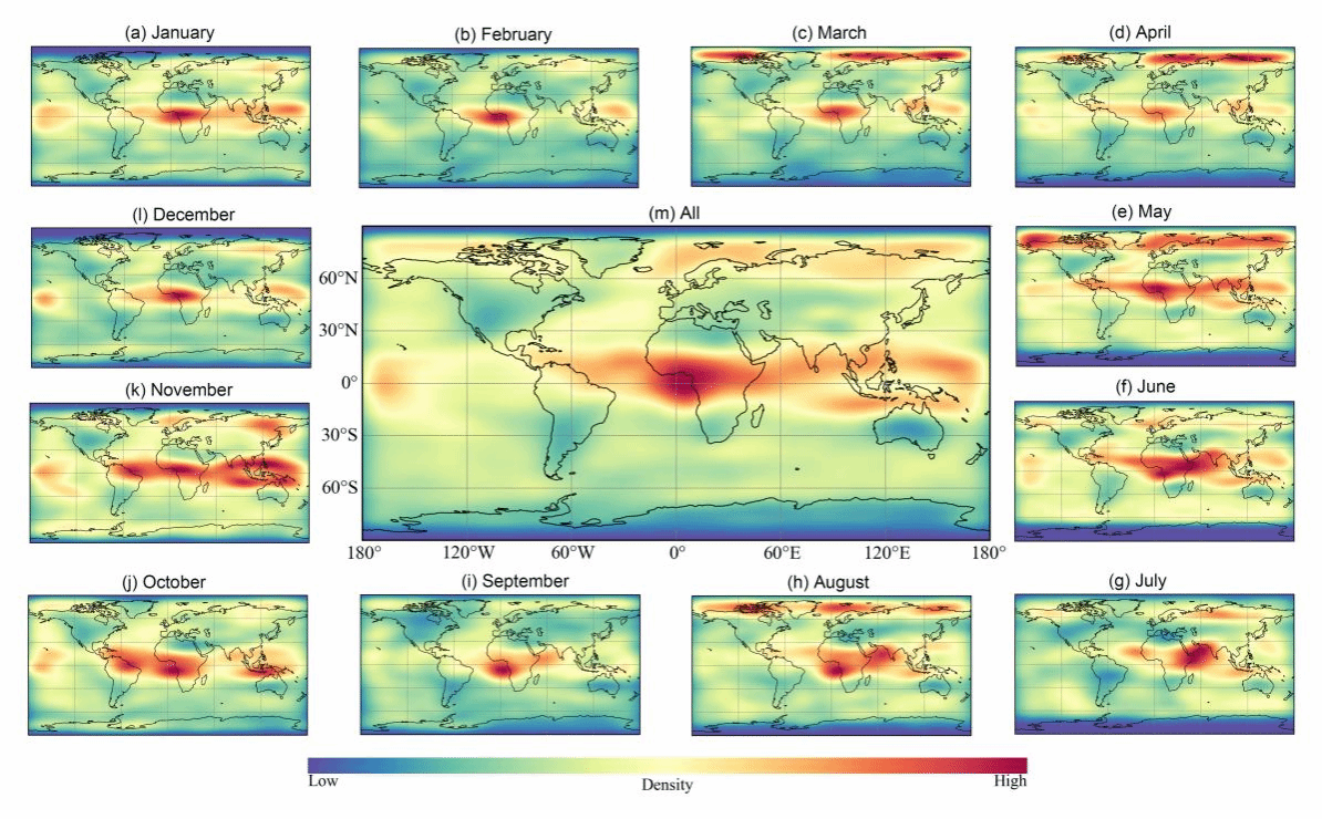 图2. 基于2016-2017年CALIPSO数据识别的气溶胶-云共存样本的空间密度图:(a-l)月平均分布,(m)年平均分布